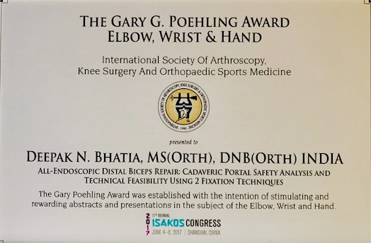 Analysis of technical feasibility and neurovascular safety of endoscopic distal biceps repair: a cadaveric study.Bhatia DN, Kandhari V. J Shoulder Elbow Surg. J Shoulder Elbow Surg. 2018 Nov;27(11):2057-2067. Epub 2018 Jun 12.